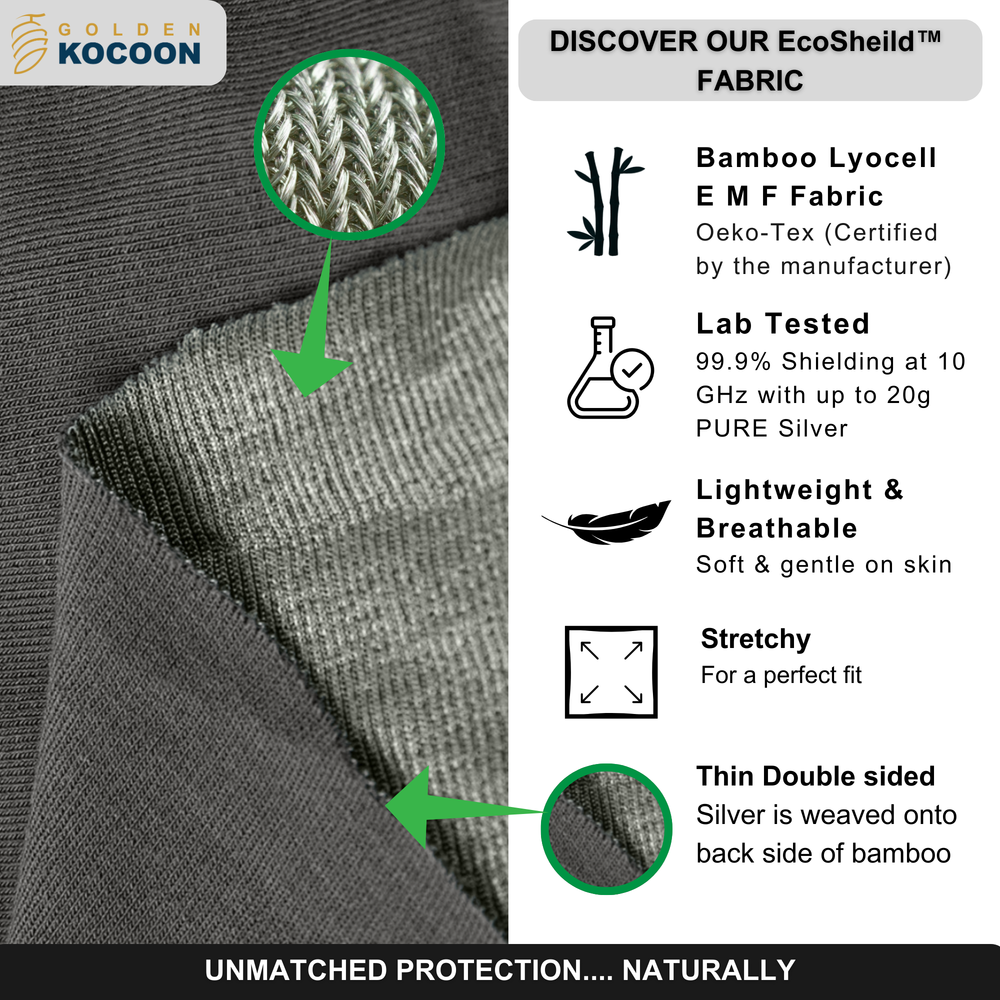 Our products are independently lab-tested to ensure they block up to 99.8% of RF radiation (including Wi-Fi, 5G, and Bluetooth), while staying eco-friendly, breathable, and kind to your skin.